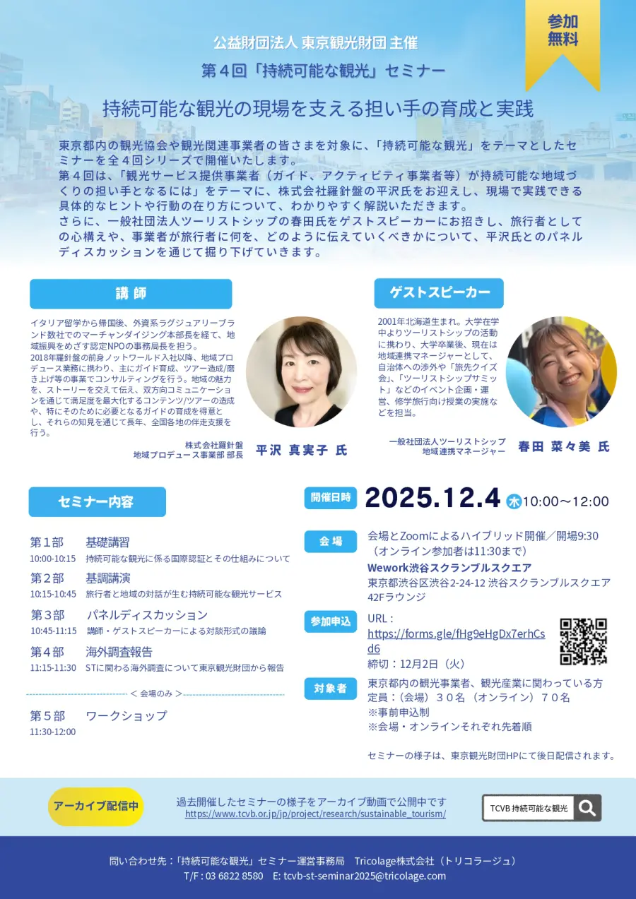 東京都及び(公財)東京観光財団は、認証の仕組みを含めてサステナブル・ツーリズムについての知識を学ぶ講座を全4回シリーズで開催しています。